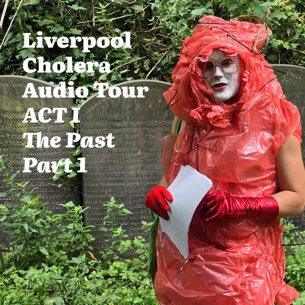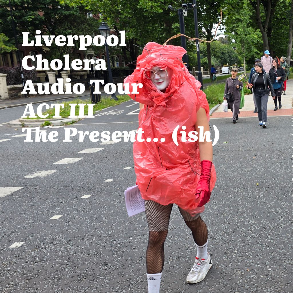 Now the audio tours take the experience into new streams and channels. The Liverpool Cholera Audio Tour is out – a four-episode podcast narrated by Cholera itself, tracing bacterial flow through Liverpool’s water histories from the 1831 epidemic and Irish Genocide to the Toxteth Uprising and today’s sewage crisis. Episodes 1 and 2 are live now and Episodes 3 and 4 dropping soon.